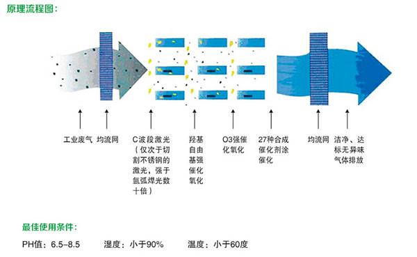 光氧催化廢氣凈化器利用的高臭氧UV紫外線光束照射、裂解廢氣,通過特定波長的UV激發光源產生不同能量的光量子;使或無機高分子廢氣化合物分子鏈,在紫外線光束照射下,在大量攜能光量子的轟擊下使廢氣物質分子解離和激發,降解轉變成低分子化合物,如CO2、H2O等。利用UV光束裂解惡臭氣體中的分子鍵,破壞的核酸(DNA),再通過臭氧進行氧化反應,達到脫臭及殺滅的廢氣處理目的。